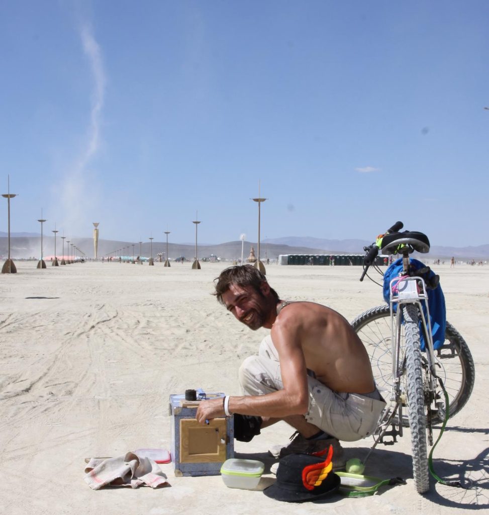 Tout a démarré en 2013 à Burning Man. Armé d’une boîte en carton, de papier photo et de chimie, je tirais le portrait des créatures extraordinaires de ce festival. Un photobooth rudimentaire.
